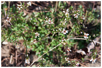 水田のあぜ、水辺の湿地などに生える越年草、高さ10~30cmになる。